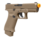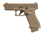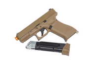 One of GLOCK's more popular recent models has been the G19X. Providing shooters with a full-size grip and a shorter overall length slide has proven to be a successful recipe. Quick handling, accurate, and full-size handgun capacity have proven to be a winner for GLOCK. This airsoft field safe G19X launches .20 gram airsoft BBs at 300 FPS and holds 14 rounds of 6mm BBs in the drop-free full-size magazine. Like the firearm, this licensed airsoft replica features a Gen 5 slide profile and grip texturing making this version a perfect fit for many shooters. This airsoft pistol is easy to identify with its Coyote tan slide, frame, and magazine extension plate. Officially licensed product of GLOCK™.