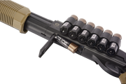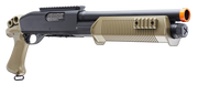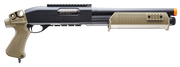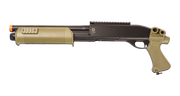 Tactical Force Tri-Shot Spring Shotgun. A full sized pump-action airsoft shotgun that is super awesome. High quality build for durability and performance. Shoots three BBs per shot with its 3-inner-barrel design. Uses most standard shotgun shells (30-round) (Tokyo Marui, Double Eagle, ASG, etc). 7 shells included in its box. Easy to pump, reliable, and very accurate. We're impressed with this solid shotgun.