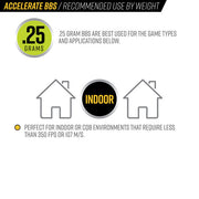 The Valken Accelerate ProMatch Tracer airsoft BBs are manufactured in Taiwan by one of the best known Airsoft BB manufacturers. These 6mm plastic BBs glow bright green when using a tracer unit or tracer magazines. They are precision grade quality, completely spherical, and polished to ensure that the BB is seamless and has no surface imperfections. These 6mm precision BBs give you greater accuracy and consistency, and they are packaged in a unique rectangular bottle with a screw-on cap making storage, transport, and loading simple and convenient. Accelerate BB bottles do not roll around like other round bottles, which can spill easily.