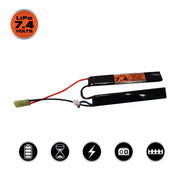 The Valken 7.4v 1400mAh Split Type Lipo airsoft battery is a high performance lithium airsoft gun battery. This lithium battery has an initial burst discharge rate of 25C, and a constant discharge rate of 15C. This nunchuck Lipo battery has no memory effect, and does not require discharging. This butterfly Lipo battery can hold a charge for months, and features a small Tamiya plug and XH 3-pin charging connector. They fit inside most crane stocks.