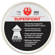 .22 caliber Ruger Impact Superpoint pellets are specifically designed for hunting and varmint control. These pointed pellets weigh in at 17 grains (1.1 grams) and are manufactured to precise tolerances for maximum penetration. The Ruger Superpoints come in a 200 count tin.