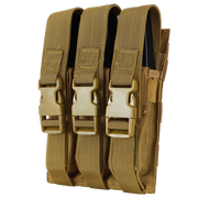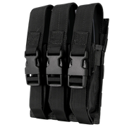 Make sure you have access to multiple magazines when you use the Triple MP5 Mag Pouch from Condor Outdoor. This durable accessory securely carries up to three MP5 magazines. Each one is secured via a hook and loop flap and has side release buckles that can be unfastened rapidly and easily with one hand. This feature of the Condor Triple MP5 Mag Pouch ensure access to your magazines at a moment's notice. Whether you're a first responder or an outdoorsman, you can use this pouch to keep extra ammunition on hand or to store spent magazines safely. Because the pouch is compatible with MOLLE webbing, you can easily attach it to a belt, harness, vest, or backpack. Choose from a variety of kit-compatible colors when you order the Triple MP5 Magazine Pouch.